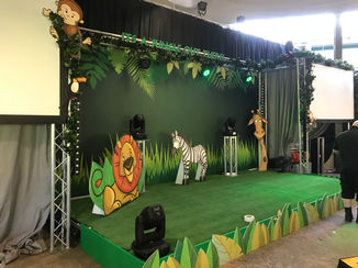 We have a 12m wide stage presentation in stock that can be rolled out with ease branded or themed with your corporate branding. The concept will give a stage area of 6m x 3m with a total width to include 2 off 3m wide screens. Full colour branding including AV, Lighting and Audio Package. This conference set is ideal to be themed as per the Price Waterhouse Cooper summer ball event that was installed with a Jungle themed.